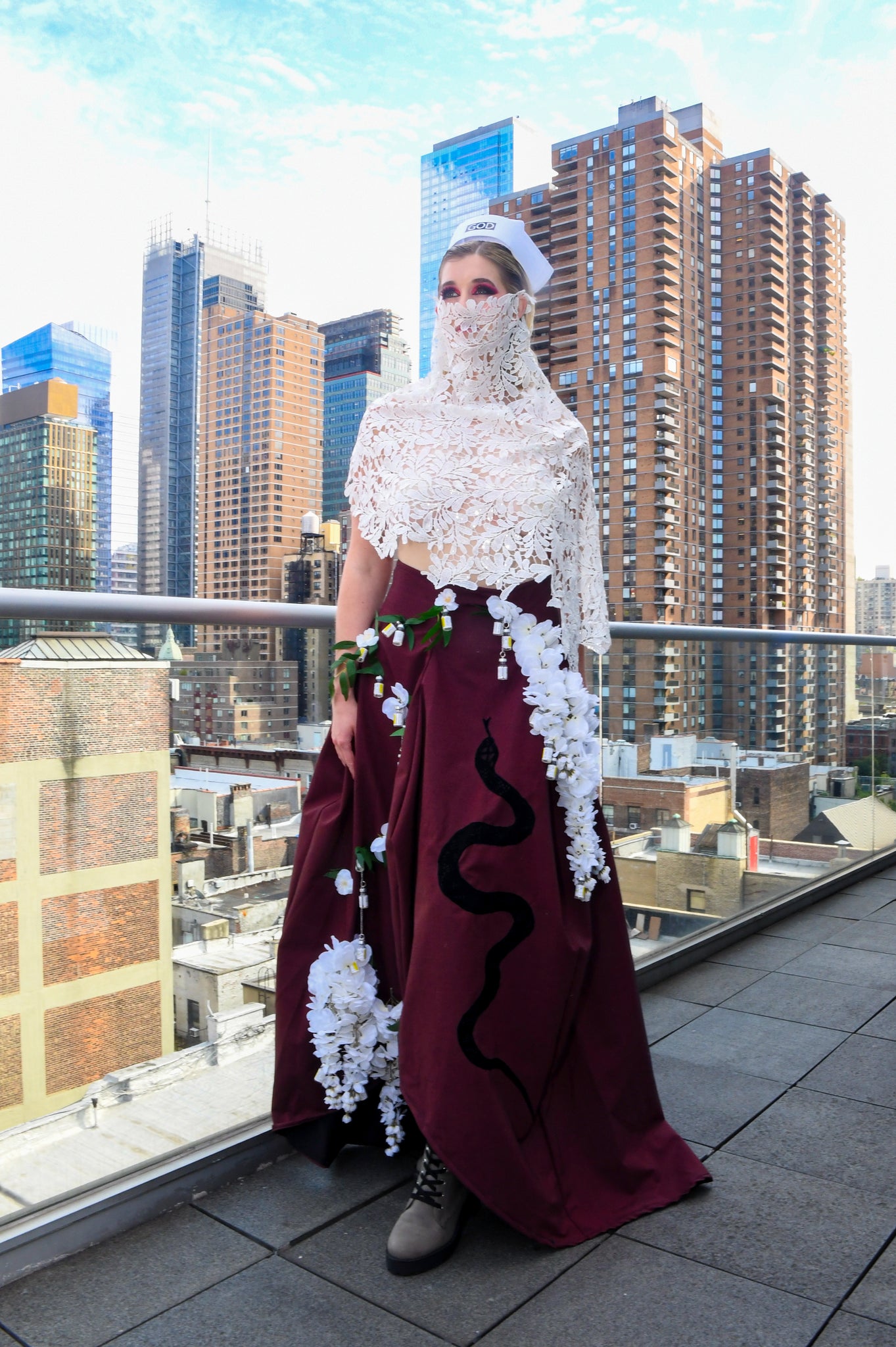 I decided to incorporate testosterone vials into this skirt to represent the fruit hanging from the tree of knowledge. I was scared when I first started hormones. I still wasn’t 100% I was transgender. I was constantly doubting myself. Despite my doubt and fear I knew that something needed to change. I needed to take action to keep myself alive.