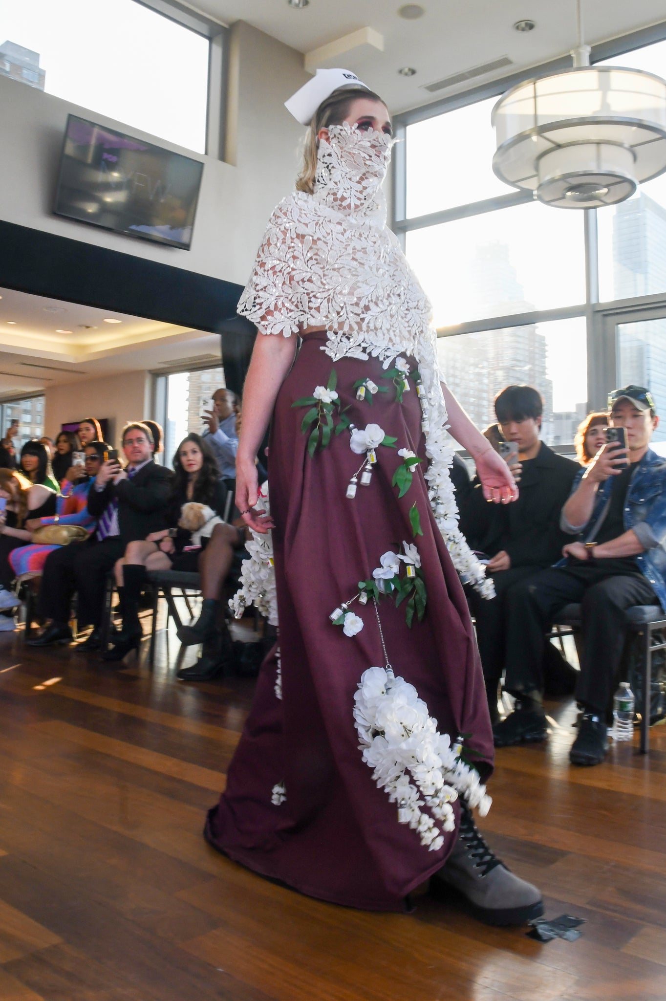 Hanging all over the skirt is white flowers and testosterone bottles. They have been cleaned and sanitized. They create fun movement for the whole skirt.