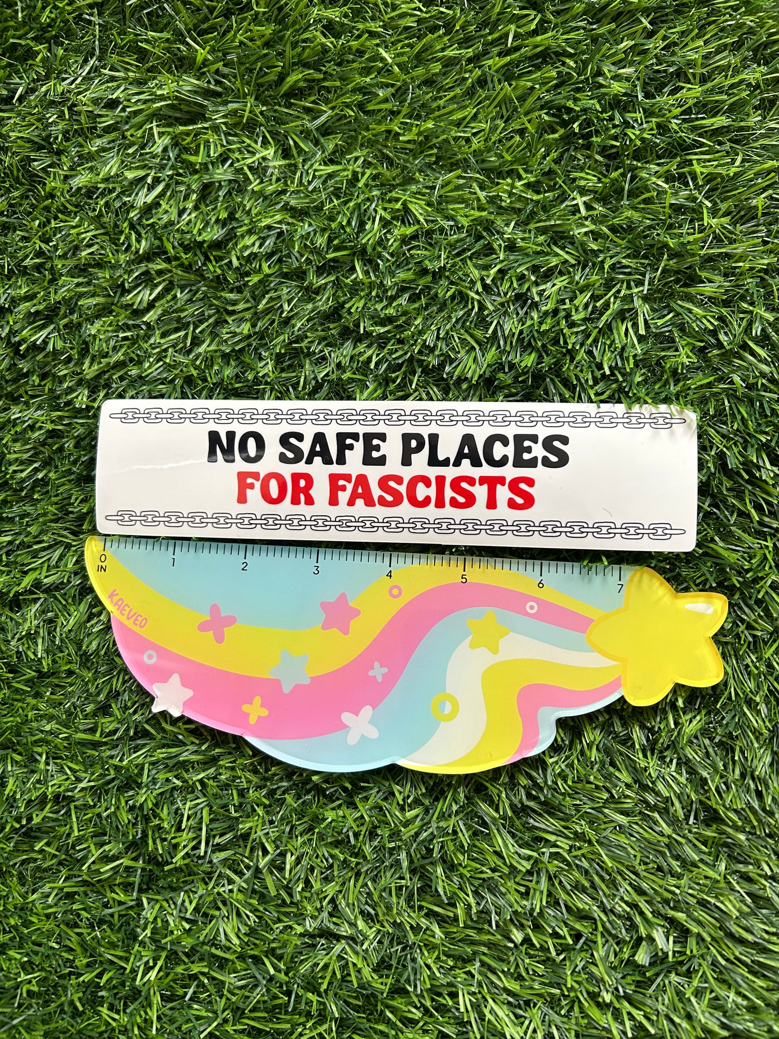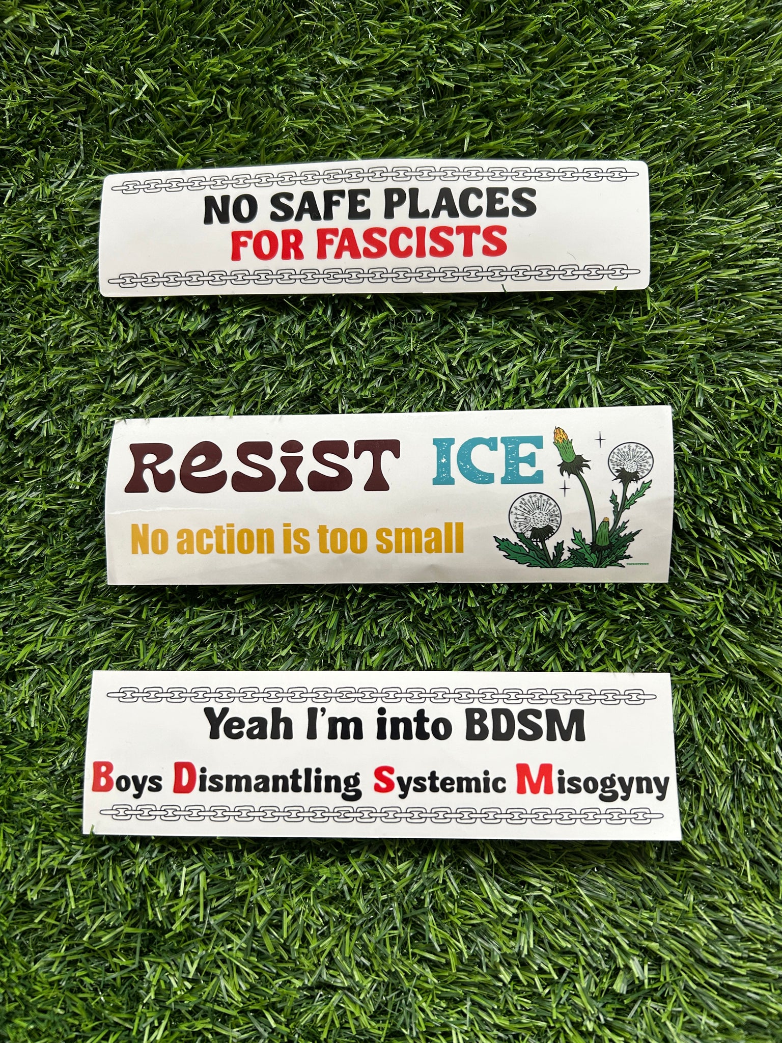 Each bumper sticker is about 8 inches by 2.5 inches. The stickers are printed on long lasting weather proof stickers. They are water proof, won’t fade in the sun and with patience(plus a heat gun) can be removed from a car without damaging it!